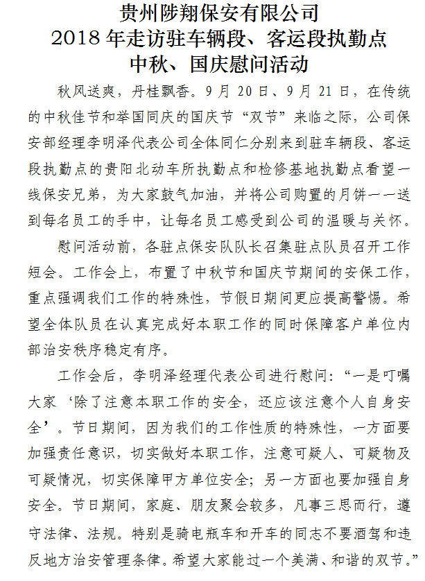 貴州陟翔保安有限公司 2018年走訪駐車輛段、客運(yùn)段執(zhí)勤點(diǎn) 中秋、國慶慰問活動(dòng)