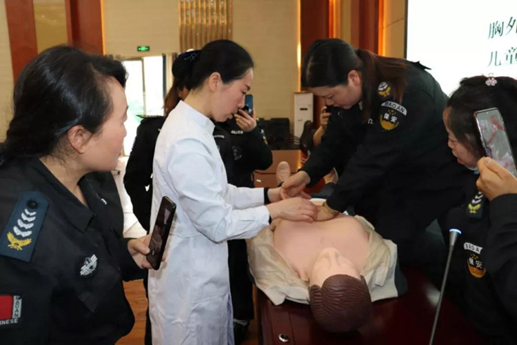 首先由新舟鎮(zhèn)衛(wèi)生院護士長一行人員為參訓(xùn)保安員講解急救要領(lǐng),現(xiàn)場演示徒手心肺復(fù)蘇操作技巧,并要求每位保安員實操練習(xí)。