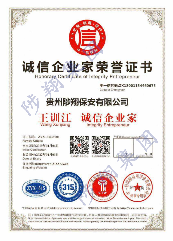 誠(chéng)信企業(yè)家榮譽(yù)證書